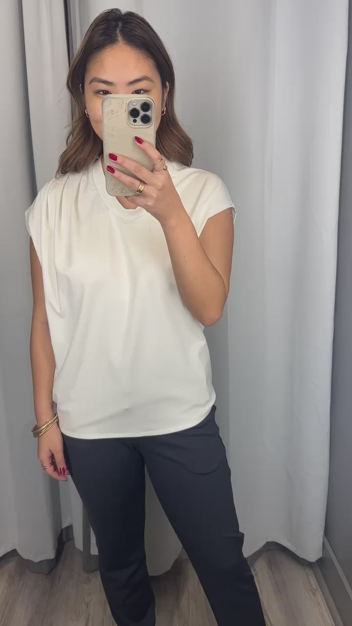 A modern, asymmetrical top featuring deep pleats on the left shoulder for an avant-garde look. The other shoulder has a slight cap sleeve to bring balance the top. The fitted hemline brings the whole top in to create a flattering shape.