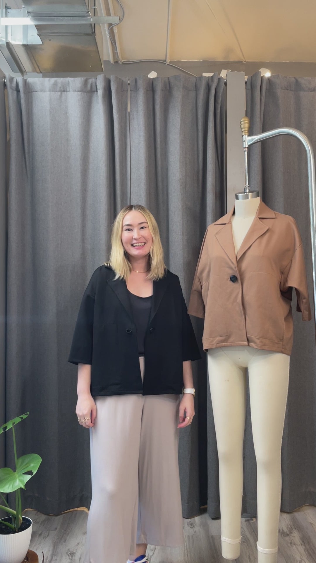 The Bryce is a structured, cropped jacket with 3/4 sleeves that was designed to comfortably fit over any outfit. Her proportions were designed for shorter heights. The oversized sleeves and body make it a comfortable office jacket or an easy way to dress up any look. When styling for colder weather, pair it with a long sleeve cover up like our Remy for a modern layered look.