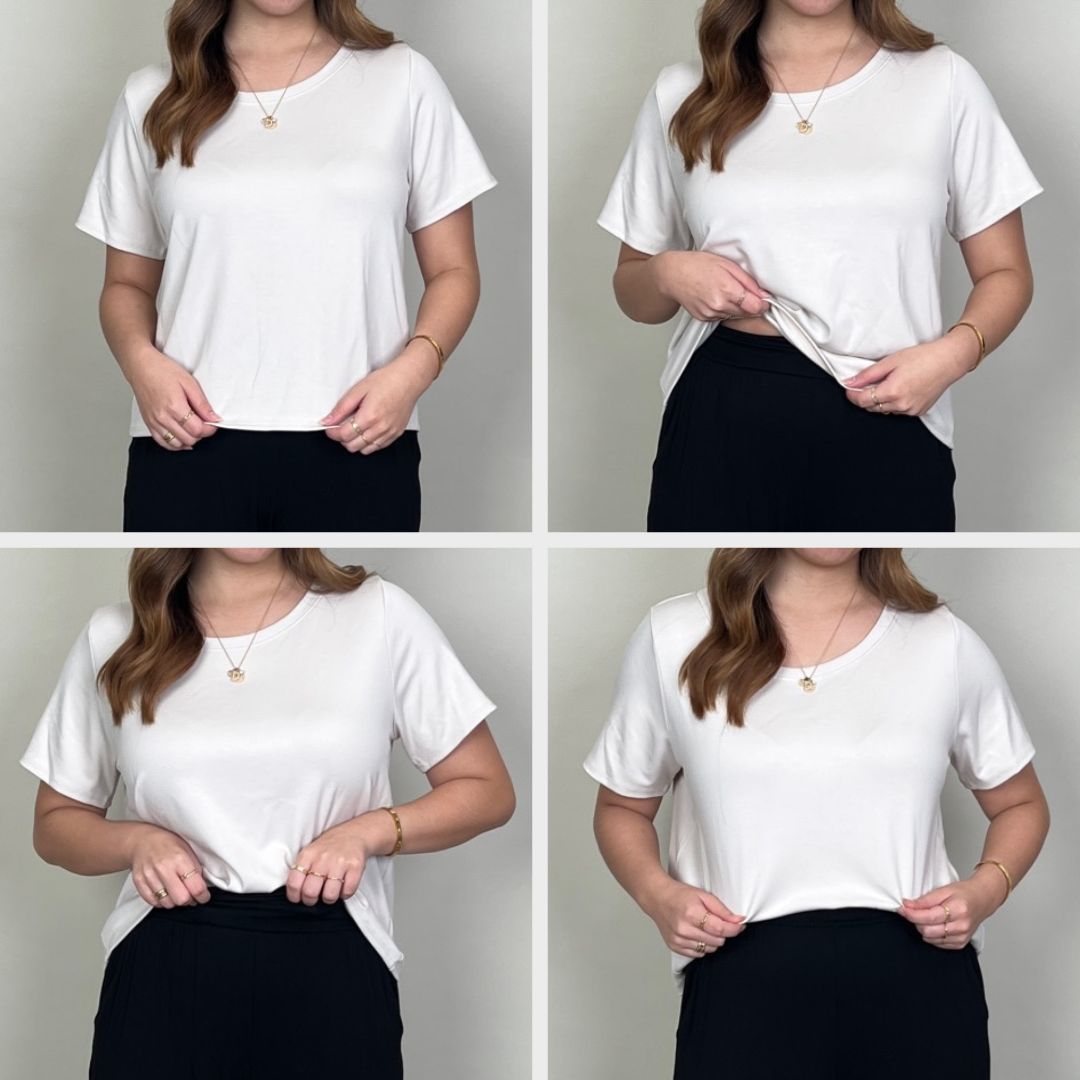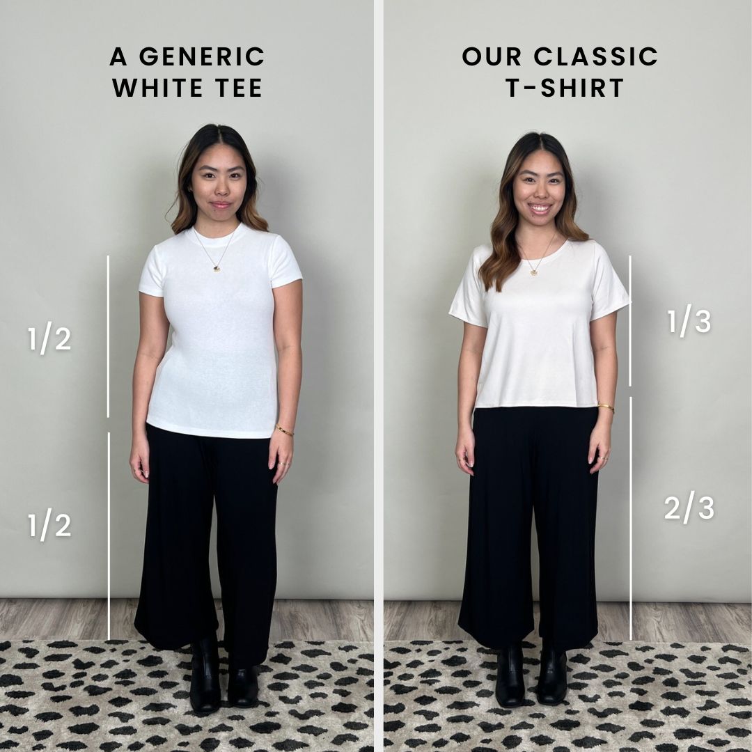 A styling trick that creates balance and elongates your silhouette. That why our Emi Top is designed to end around the 1/3 mark of your body, letting your bottoms carry the lower 2/3. That small shift creates a big difference.