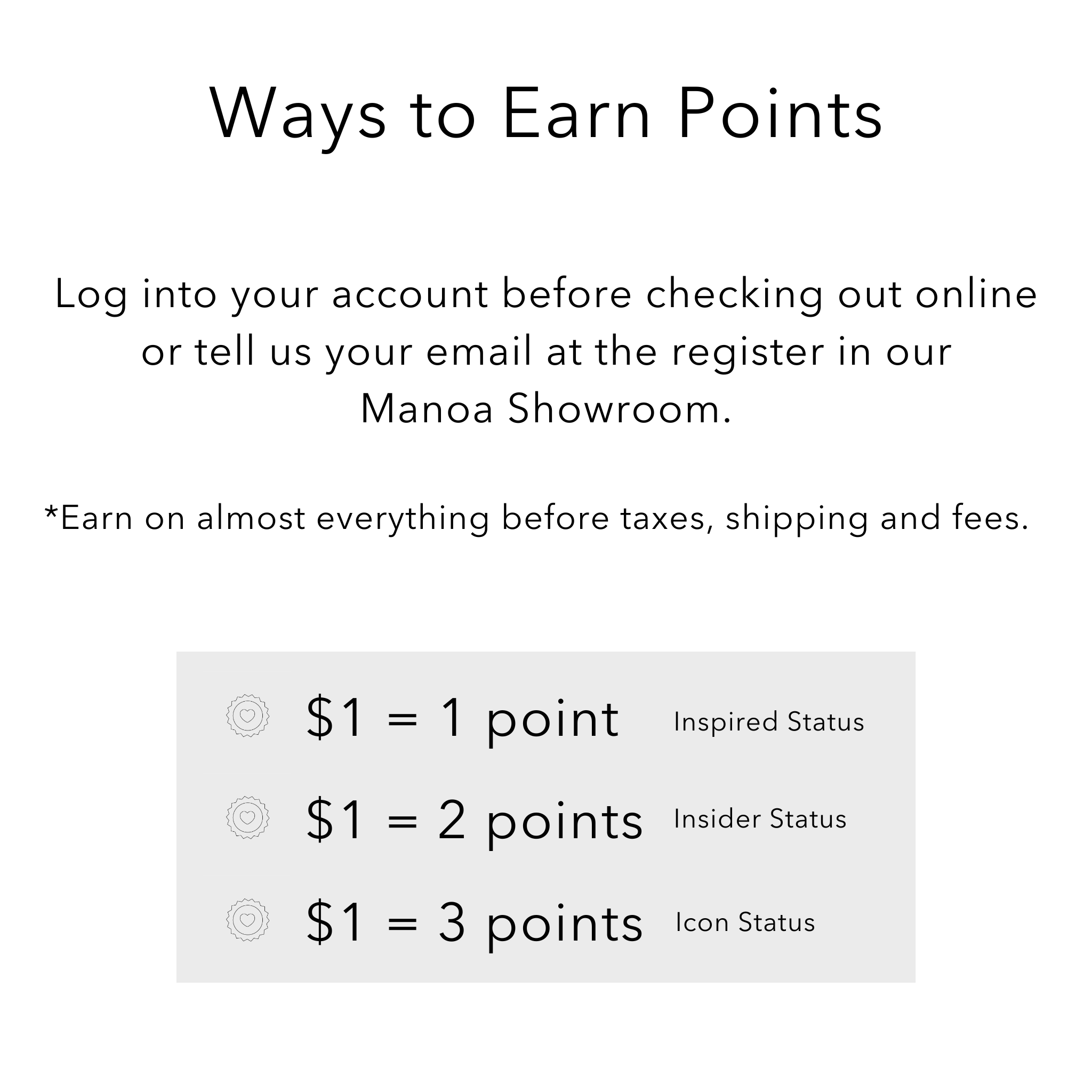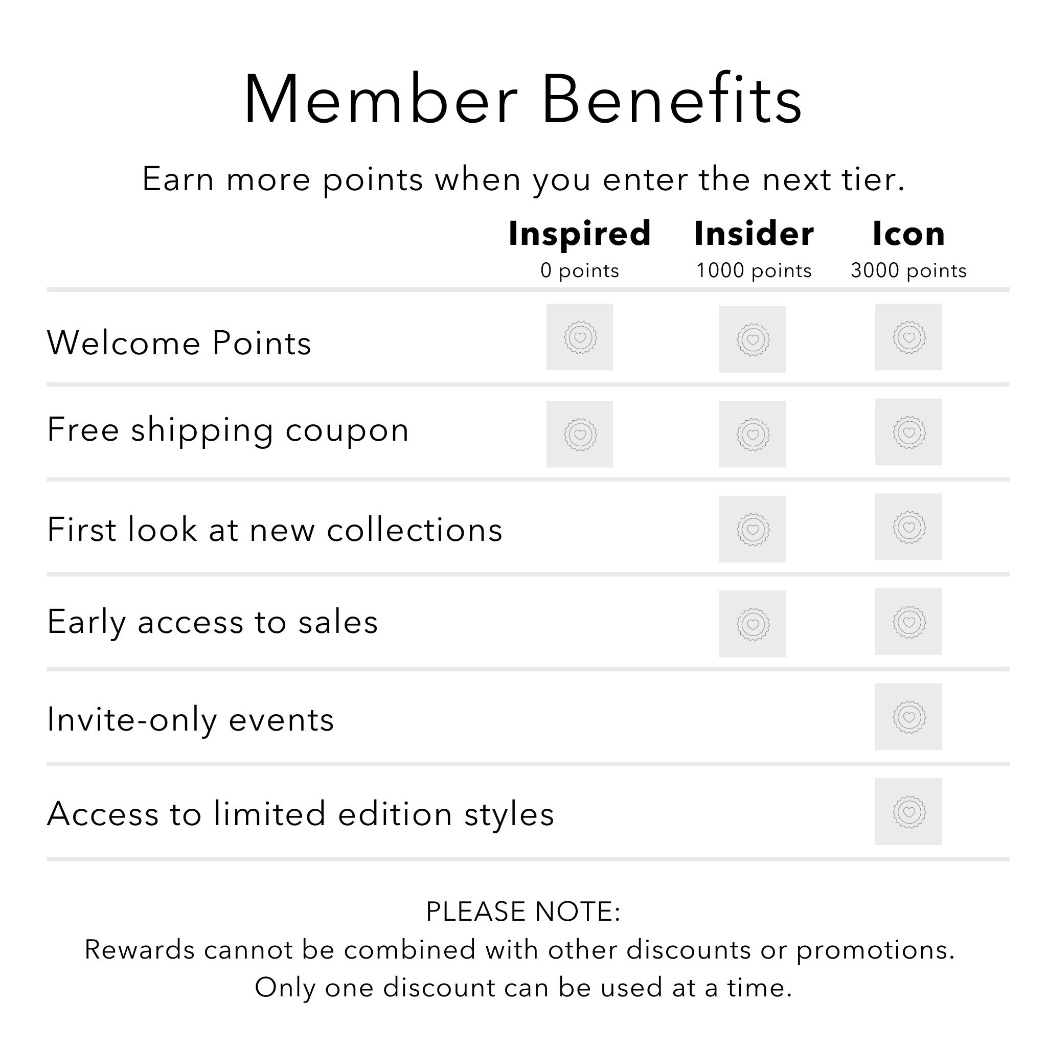 Once you create an account with us, you'll automatically be put into our Izu Inspired tier. As you continue to shop and earn points, you'll be eligible to move into our Izu Insider tier (minimum of 1000 points) and Izu Icon tier (minimum of 3000 points). As soon as you hit the minimum points required for the next tier, you'll automatically be pushed up, granting you even more exclusive perks just for you!