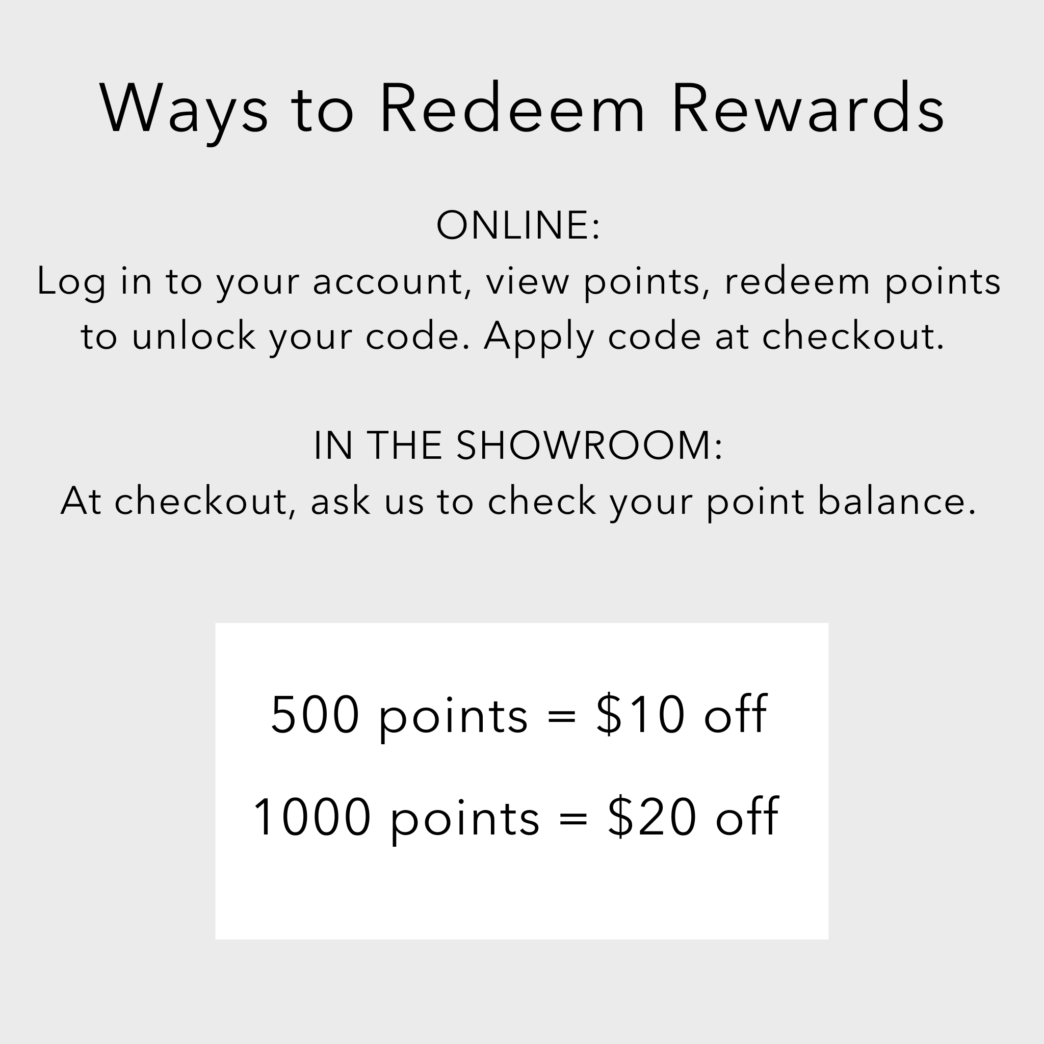 Once you've accumulated enough points, you can redeem your points for a discount on your next purchase. Redeem 500 points for $10 off or 1,000 points for $20 off.